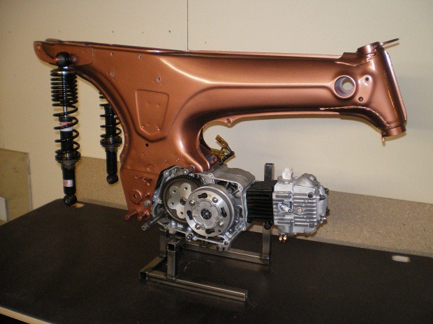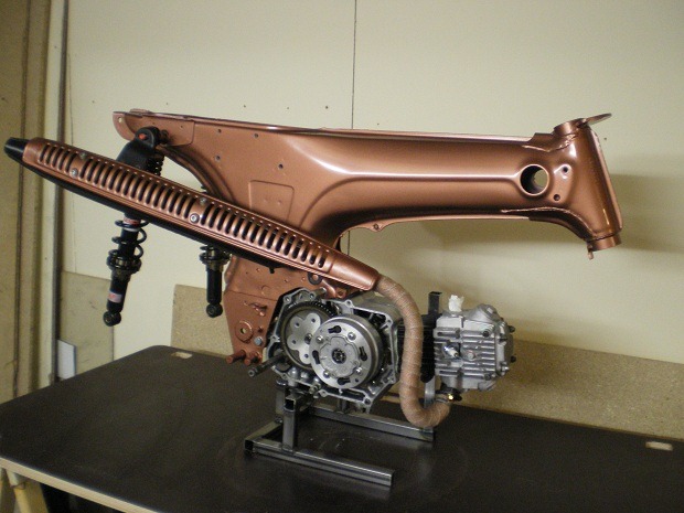 Ich Geistesblitz hätte die Zentrierhülsen vermutlich wieder vergessen, wenn mein Kollege mich nicht gefragt hätte, was ich heute noch mache…. Was ich dann heute noch gemacht habe, war natürlich den Motor obenherum zu komplettieren. Es war ja alles soweit vorbereitet und nur die beiden Zentrierhülsen zwischen Zylinder und Zylinderkopf haben noch gefehlt. Steuerzeiten einstellen ist bei diesen Motoren kein Aufwand und schnell erledigt. Den Zündzeitpunkt hab ich auch noch eingestellt, aber anblitzen werde ich ihn trotzdem noch wenn der Motor läuft. Und die Steuerkettenspannung hab ich eingestellt, das muss aber bei laufendem Motor auch nochmal gemacht werden. Der Motor dreht schön leicht und ruckfrei, alle Gänge lassen sich sauber schalten und ganz ordentlich sieht er soweit auch wieder aus. Jetzt muss ich nur endlich den Kupplungsdeckel fertig machen und dann ist die Motorengeschichte erstmal erledigt. Um dem Flo ein bisschen feuchte Träume zu bescheren, hab ich mir mal erlaubt den Rahmen auf den Motor zu schrauben… und die Stoßdämpfer… und den Auspuff…. Ich denke, die Dax wird ganz ordentlich aussehen, wenn sie fertig ist.
